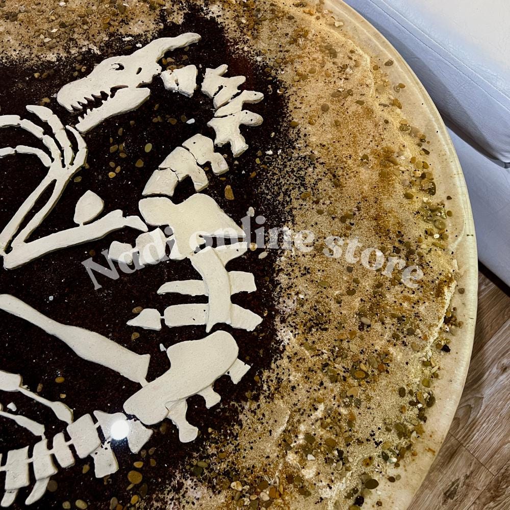 Dinosaur themed epoxy resin clear coffee table, ultra realistic fossil bedside nightstand, end table with metal legs, live edge pebble sand